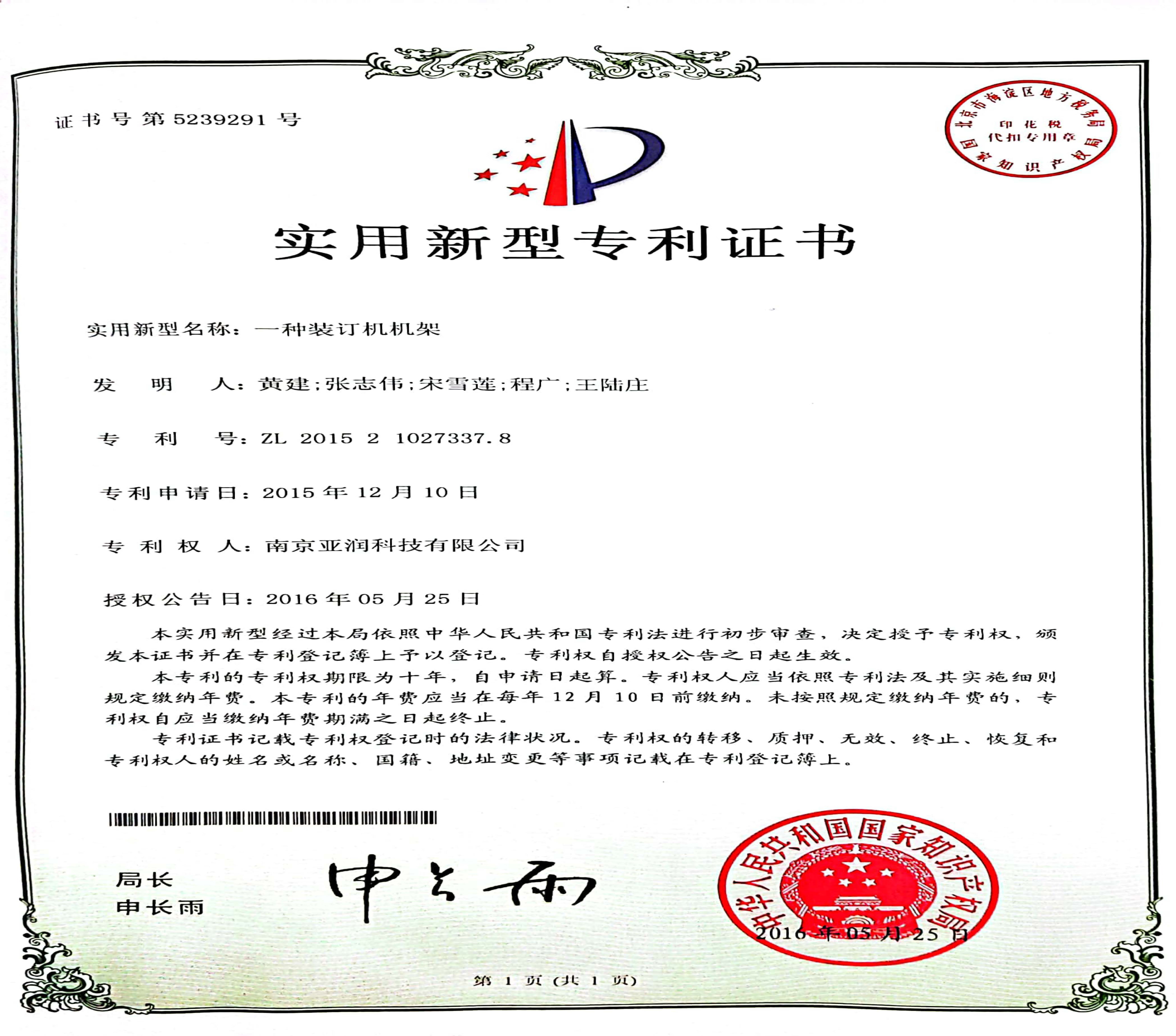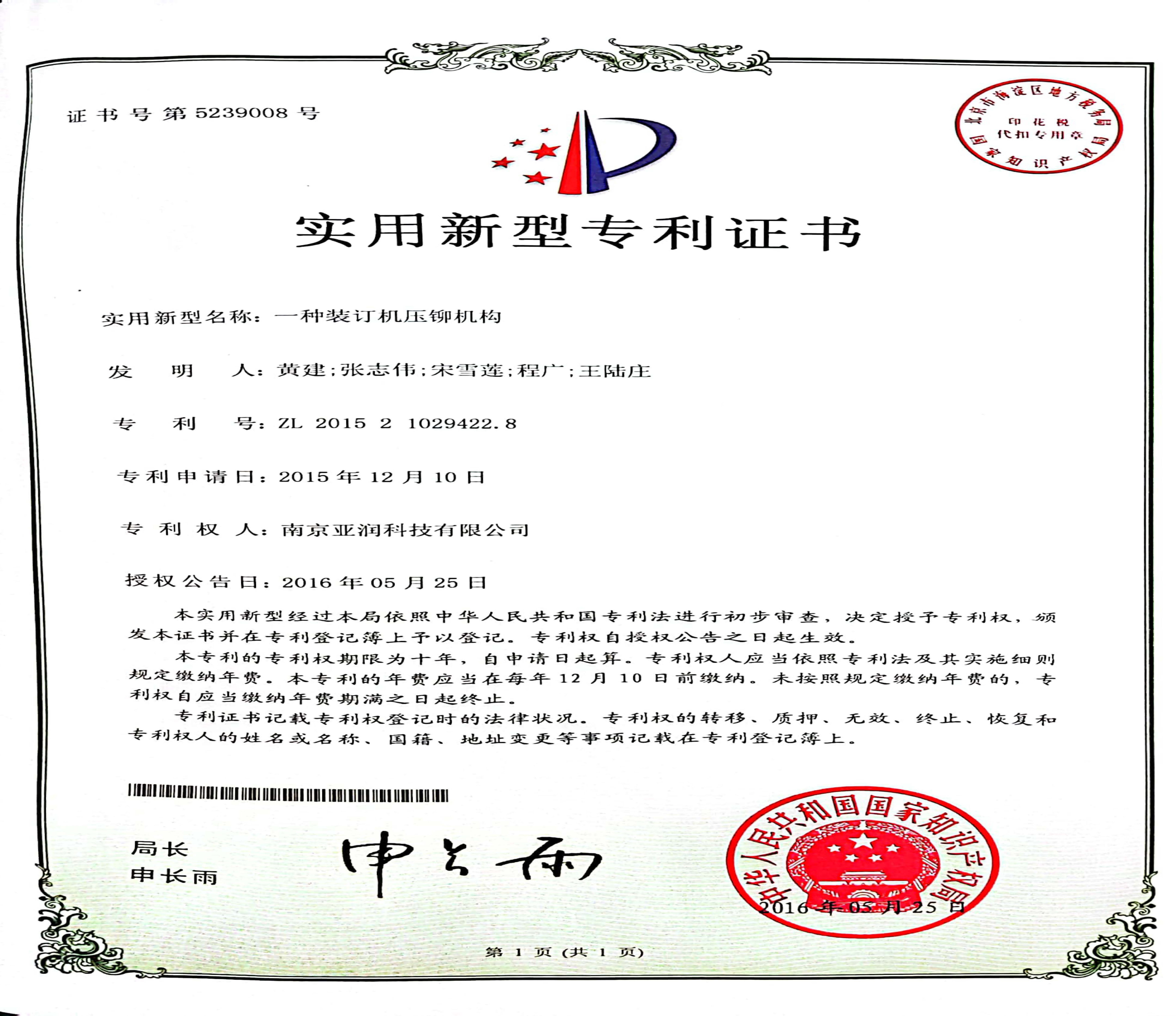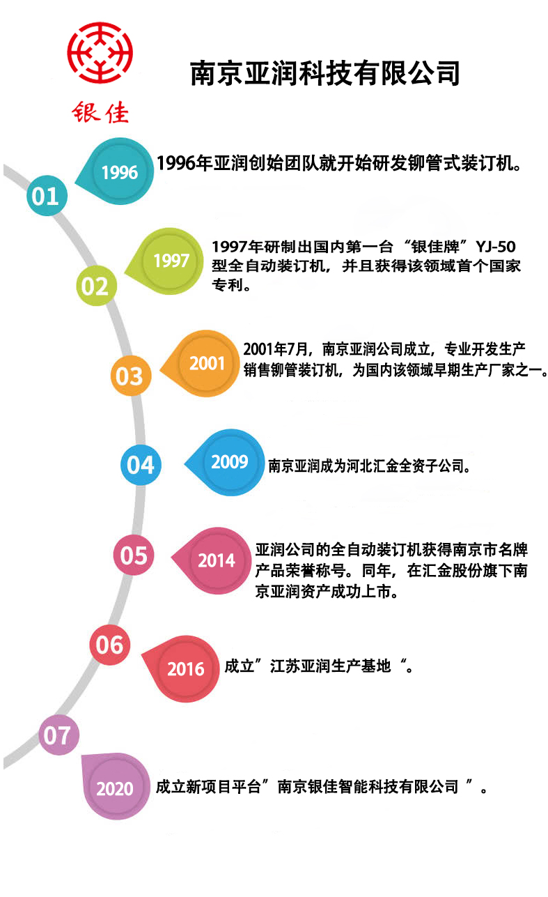 2001年7月23日,南京亚润公司成立,专业开发、生产、销售铆管装订机,为国内该领域早期生产厂家之一。