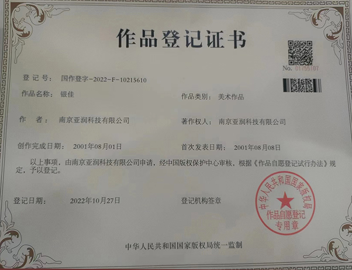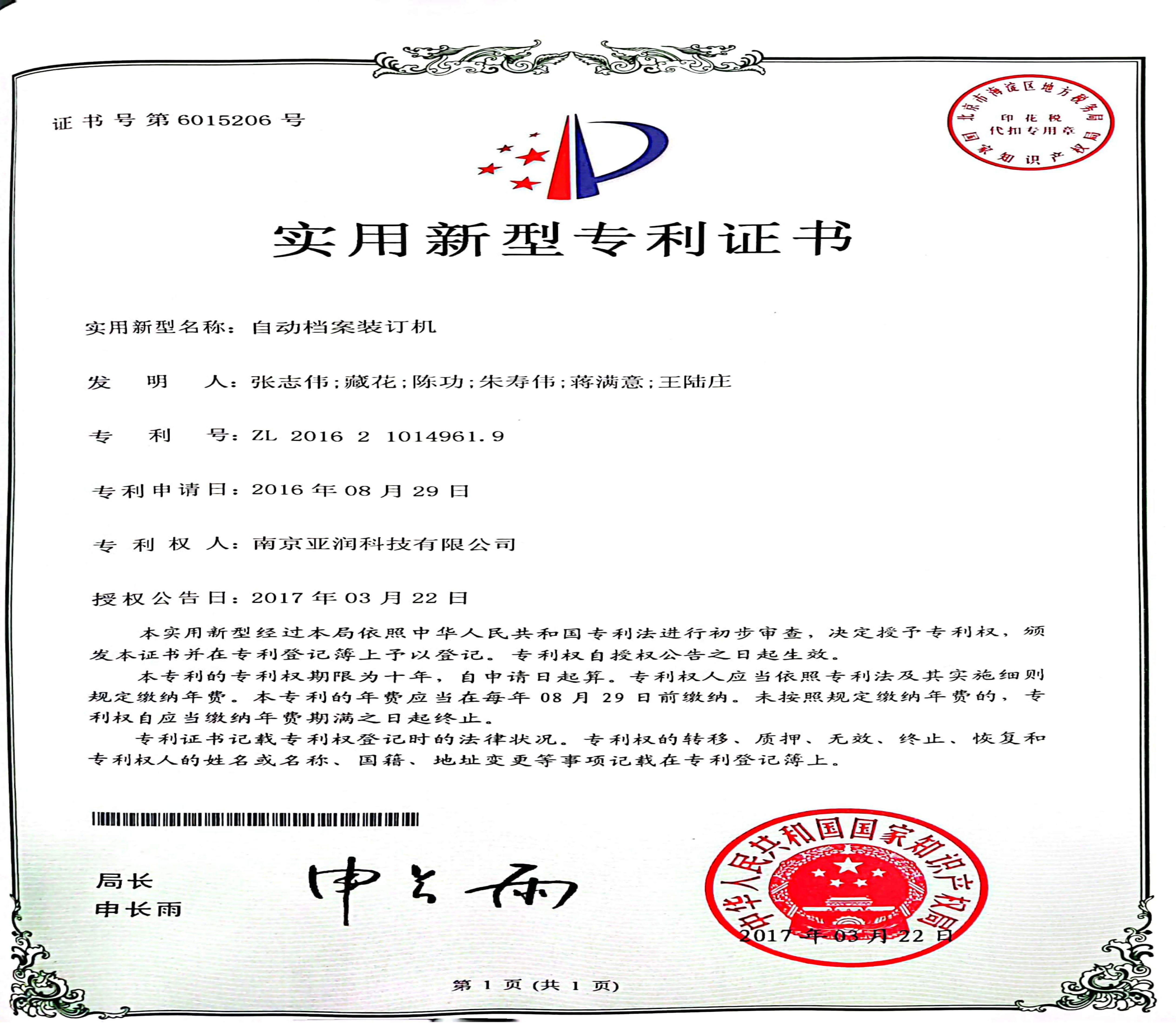 1997年,公司研发出国内第一台“银佳牌”YJ-50型全自动装订机,并且获得该领域首批国家专利,成为国内第一家集专业研发、生产、销售及服务为一体的装订机生产厂家;二十多年来,公司相继拥有了几十项专利权和著作权的系列产品。